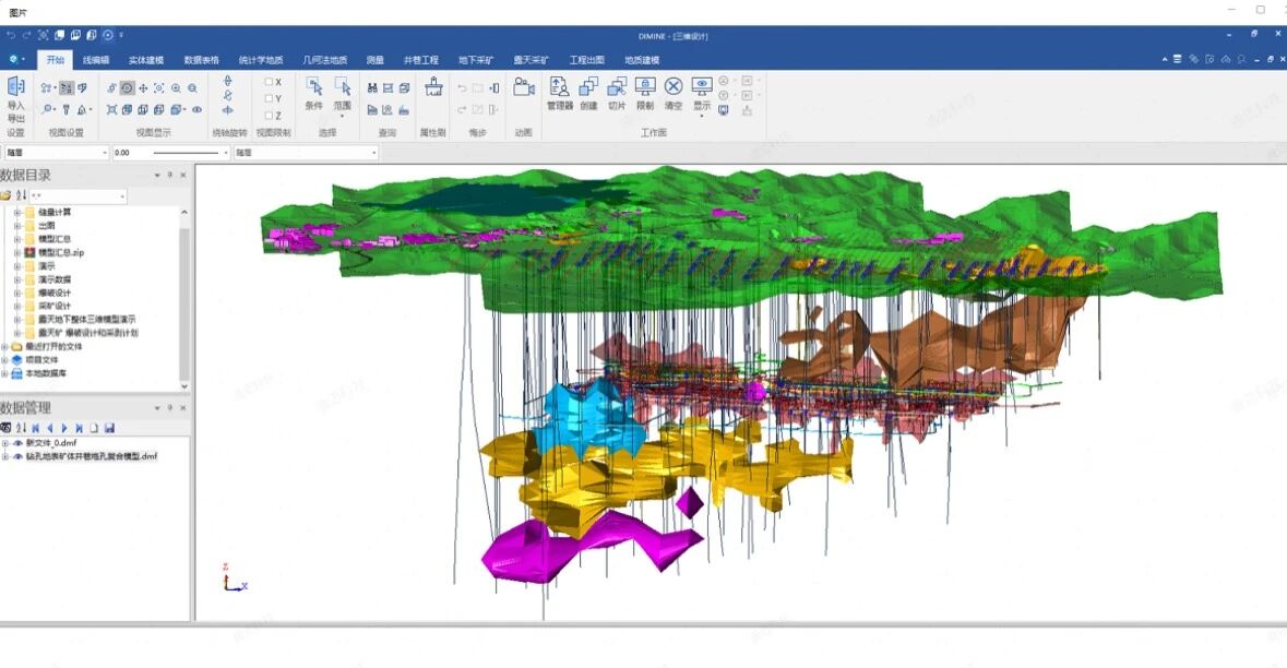 圖1-利用DIMINE構(gòu)建包含地形、礦體、邊坡等要素的三維實體模型
